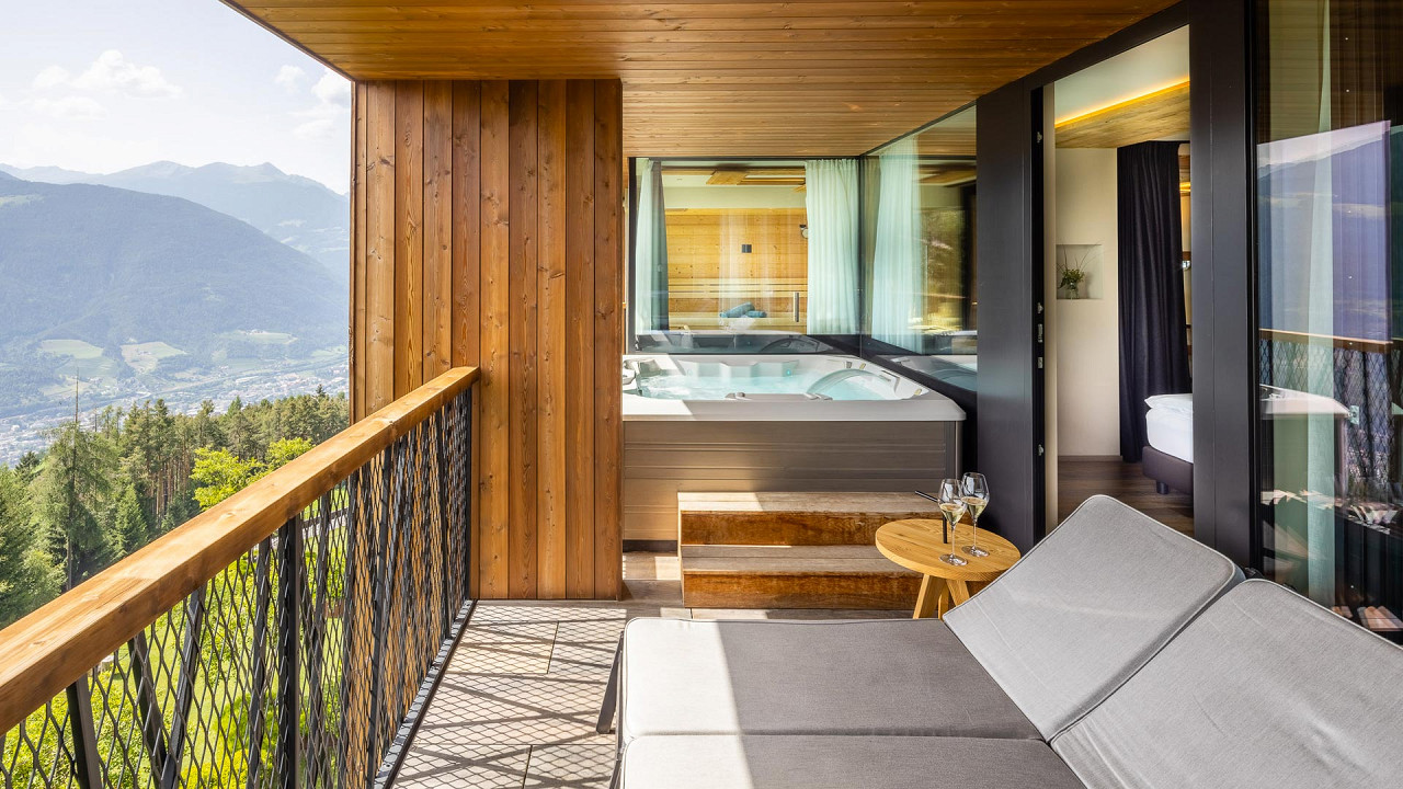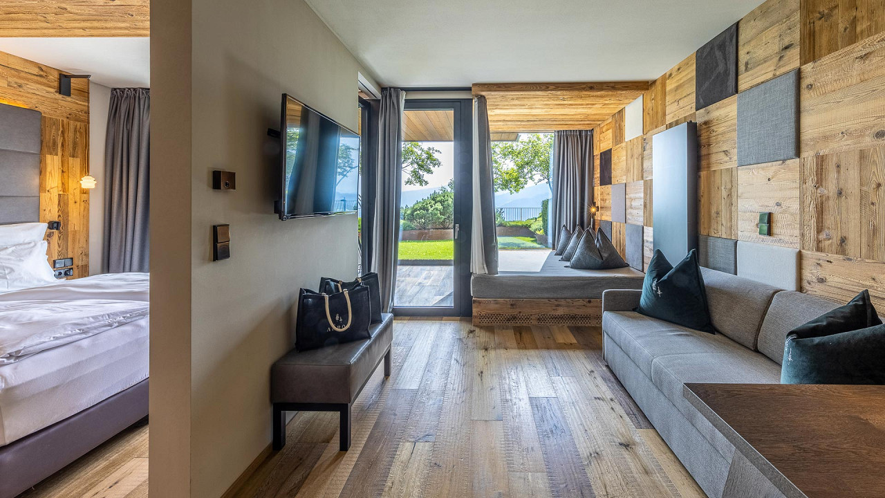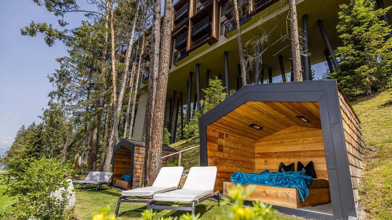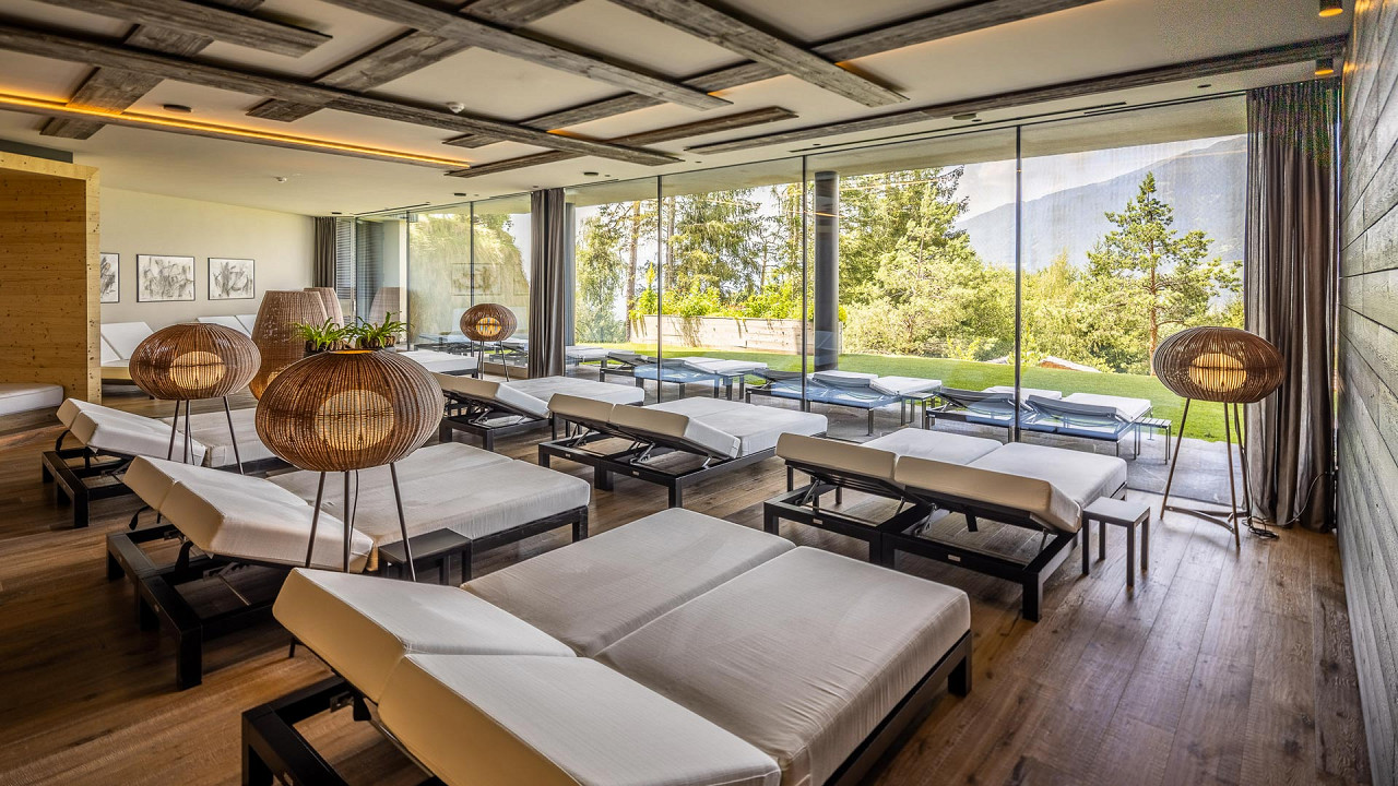 L'architecte qui a créé les intérieurs, Gerhard Tauber, a été capable de recréer une structure qui se souvient des arbres et peut être vu partout: dans la combinaison des couleurs, dans l'utilisation de mélèze antique et de bois d'épicé obscurci par soleil dans les suites, sur les murs de verre, dans les tissus comme le loden et le lin et même dans les soins de Spa.