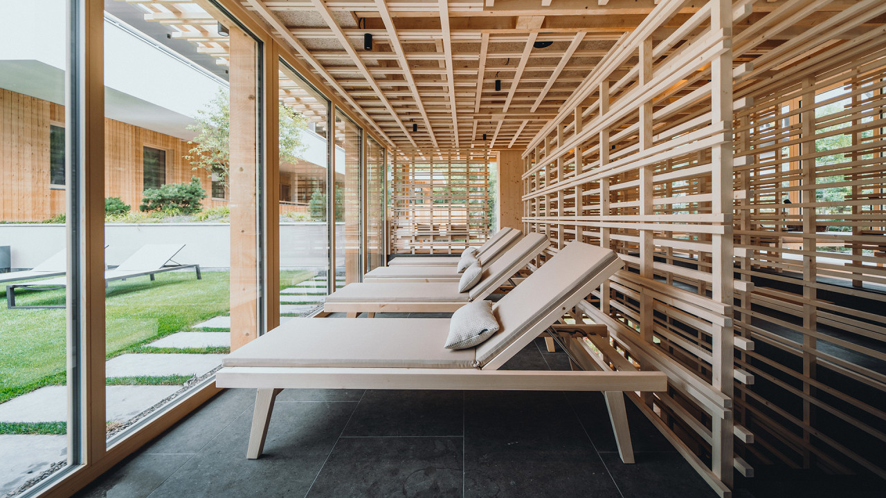 Dans l'espace bien-être, vous pouvez trouver la paix de l'esprit, en vous concentrant sur l'ici et maintenant. Il y a un sauna finlandais, un grand sauna finlandais événementiel avec vue sur la forêt et le Schlern, un sauna bio à infrarouge, un sauna à vapeur, trois espaces de détente avec des fenêtres panoramiques donnant sur la forêt, une piscine intérieure et extérieure chauffée, et une salle de fitness. L'espace beauté propose des soins personnalisés.