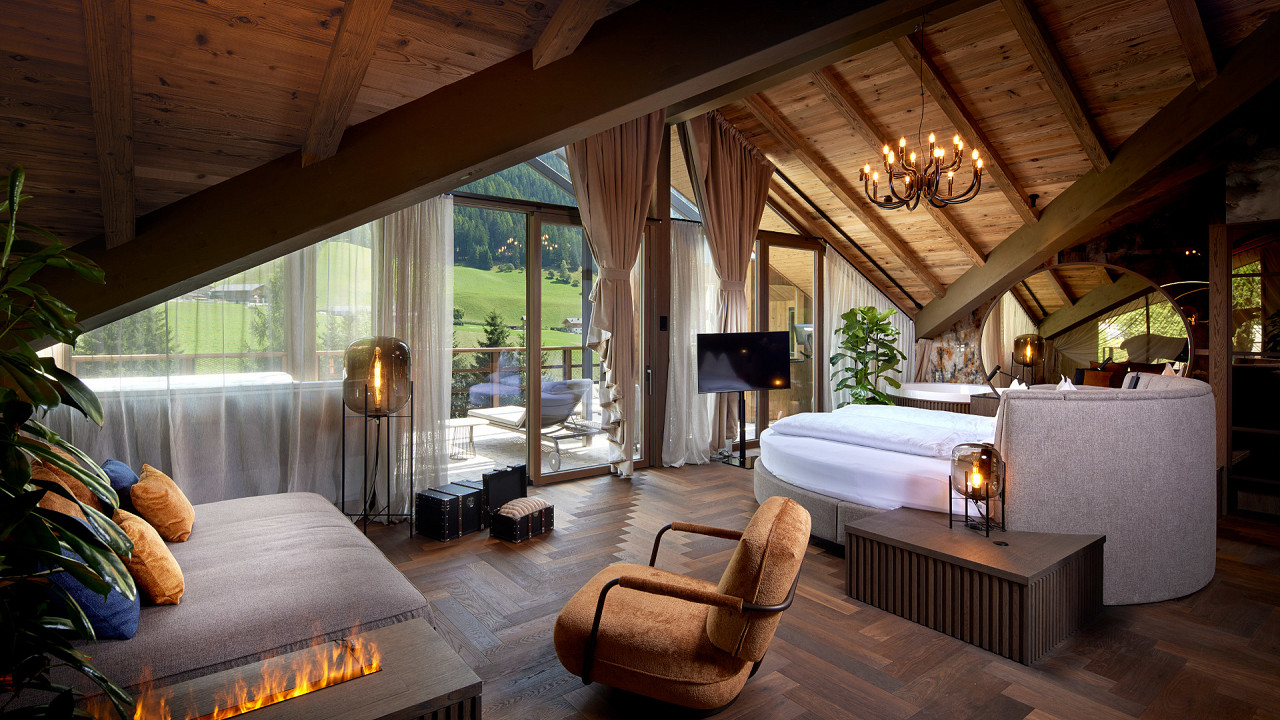 Suite relaxante dans le style "Alpine Lifestyle" avec un luxueux lit rond, une salle de bain romantique, une cheminée "R...